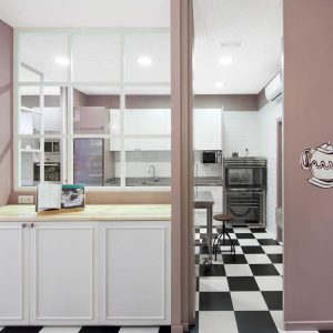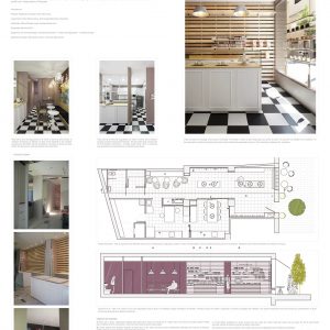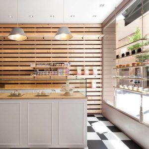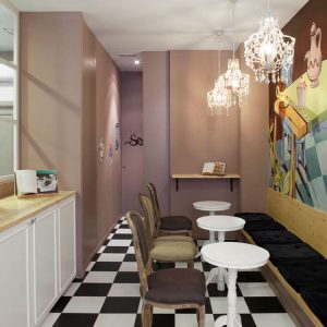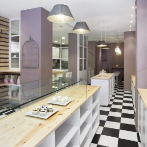 El objetivo era crear una tienda de cupcakes que nos recordara a «Alicia en el país de las maravillas» de forma sutil, por lo que se colocó damero y un mural pintado in situ en la zona de degustación. La tienda tenía que tener 4 zonas diferenciadas: zona de venta de cupcakes y utensilios para hacer pasteles, zona de talleres, obrador y pequeña zona degustación. Se forraron las paredes con lamas de madera de abeto separadas 4 cms entre sí para poder colocar unos ganchos móviles de hierro para colgar todo el producto retail. Todo el mobiliario se hizo de Dm para pintar en la obra en blanco y las paredes se pintaron en color Mirra. Las zonas de separación de espacios se hicieron con puertas correderas o ventanales de Dm con cuarterones con cristales para que todas las áreas se pudieran ver desde cualquier rincón de la tienda. Todo el mobiliario se diseñó a medida especialmente para esta tienda.