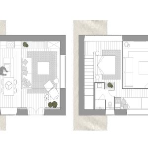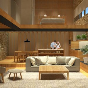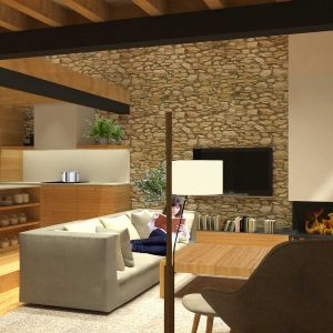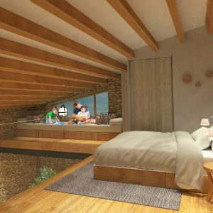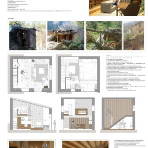 Una antigua porqueriza de 45m2 pasó a ser una casita de turismo rural después de la intervención. Ganando 2mts de altura mediante un juego de niveles a distintas alturas se consiguió sectorizar el espacio y crear distintos espacios según su uso. En la zona más baja de la planta se ubicó el salón con una chimenea vertical recorriendo toda la altura. En un nivel superior pero en la misma planta baja se destinó a la zona de cocina y comedor, completamente abierta al espacio general. En la zona del altillo se situó una cama doble, un baño y una zona de tarimas en la ventana haciendo la doble función de lectura y aprovechar para dos camas individuales. La barandilla de este espacio se hizo de cristal para dar sensación de amplitud y unificar las dos alturas. La casita tenía que ser ecológica haciendo uso de los propios materiales del entorno.