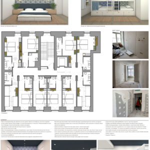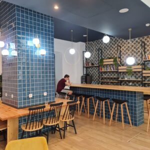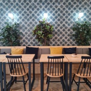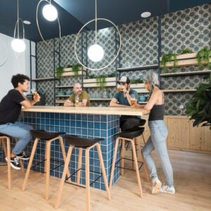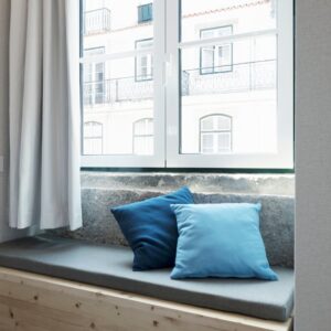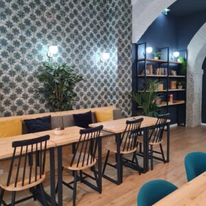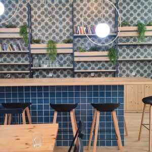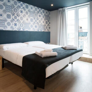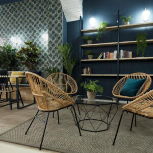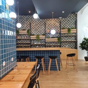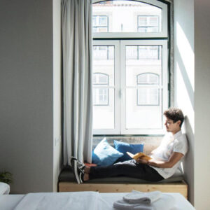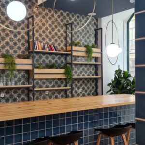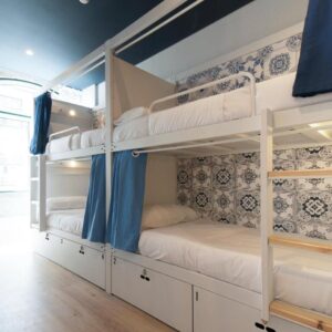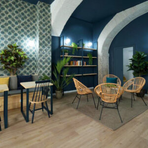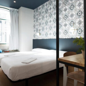 El Hostel Rodamón Lisboa está diseñado sobre una antigua fábrica de tejidos en el centro de Lisboa de la que se han conservado sus característicos arcos de piedra, que dotan de mucha personalidad a la planta baja. Conceptualmente quisimos plasmar con diferentes materiales, la ciudad ecléctica que es hoy en día utilizando las típicas cerámicas portuguesas de las fachadas, pero creando un interior completamente contemporáneo. Se creó un ambiente donde se unen elementos más ornamentales como las cerámicas estampadas y las lámparas doradas, con materiales más naturales como la madera de pino, el mimbre o la vegetación, todo combinado con mobiliario más industrial de estructura de hierro, teniendo siempre muy presente la imagen de marca Rodamón utilizada en otros Hostels de la cadena. El total protagonista de la planta baja es la cerámica estampada portuguesa, que adorna el pavimento y las paredes frontales de la recepción, la sala de estar y la trasera de los diferentes muebles. En las plantas superiores, donde se ubican las habitaciones, el alicatado cerámico pasa a ser papel pintado siguiendo siempre el mismo hilo conductor.