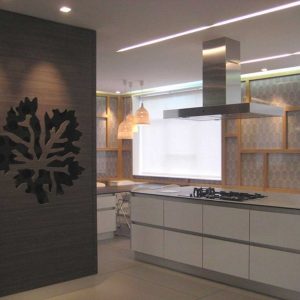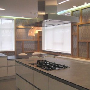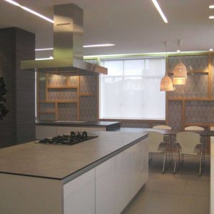 El objetivo del proyecto era crear un espacio que sirviera a Formica® de muestrario y catálogo en 3d de todos sus múltiples productos, por lo que se ha optado por crear un concepto de revestimiento de pared versátil inspirado en los paneles japoneses y en los juegos volumétricos del artista Sean Scully, con unos falsos ventanales realizados en Color Core donde se ha aplicado Formica Bespoke® reproduciendo un diseño de la gama Trends y el empleo de Decometal® como recurso artístico en columnas. Este revestimiento permitirá, a la llegada de nuevos materiales y acabados de Formica® substituir fácilmente unos laminados por otros, por lo que las posibilidades de mostrar todo el potencial de Formica® en un mismo espacio, son infinitas…