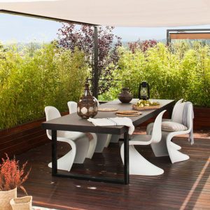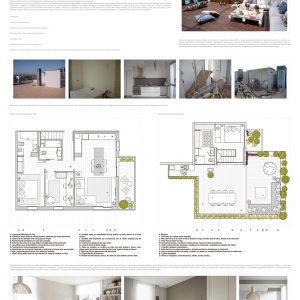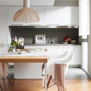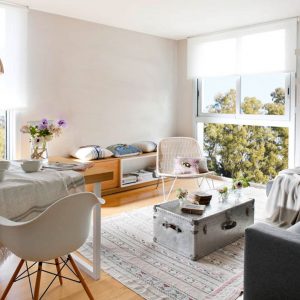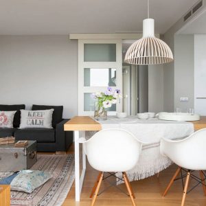 Queríamos un ambiente lleno de luz, con diseño atemporal y ecléctico, y poner especial atención a la terraza con vistas a Montserrat y a Collserola. Se derribó la pared que dividía la cocina y el salón para crear un único ambiente con un elemento unificador: una gran mesa de comedor en roble que hacía de mesa y de almacenaje de vajilla. El mueble del salón se diseñó para que en ocasiones se convirtiese en banco para ampliar la capacidad del salón. Se diseñaron a medida los muebles altos de cocina para esconder la campana extractora y se integraron todos los electros para tener una limpia visión desde el salón. La terraza de 85 m2 forrada en madera de ipe, se divide en 2 espacios: zona comedor y zona chill out. Para el comedor se diseñó una gran mesa en hierro lacado en negro y con sobre de piedra natural y para la zona chill out, donde se quería un ambiente más desenfadado, se diseñaron unos grandes sofás con palés recuperados pintados de blanco.